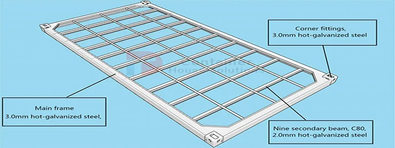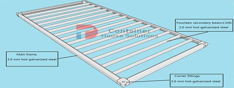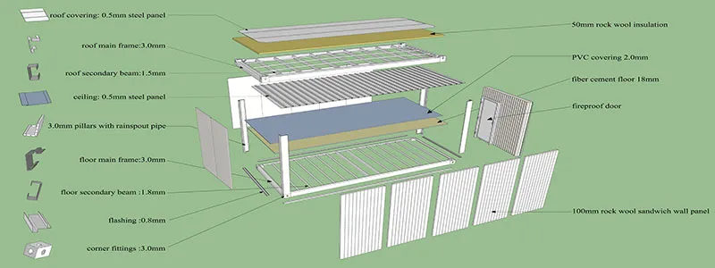 | 地面 | (1)密封板:0.5mm彩钢板(热镀锌防腐) (2)框架:3mm热镀锌钢结构 (3)绝缘:75mm岩棉保温层 (4)地板:18mm纤维水泥地板 (5 )地板覆盖:PVC覆盖1.8mm/强化地板/瓷砖地板 |