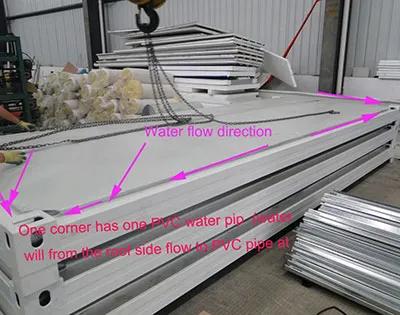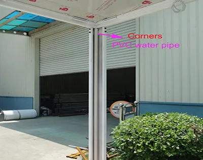 | 屋顶 | (1)覆盖层:0.5mm厚钢板(热镀锌防腐) (2)框架:3mm热镀锌钢梁。 (3)立柱:四根带瀑布管的3mm镀锌钢柱 (4)保温层:75mm岩棉保温层 (5)吊顶:单层板吊顶或夹芯板吊顶 |